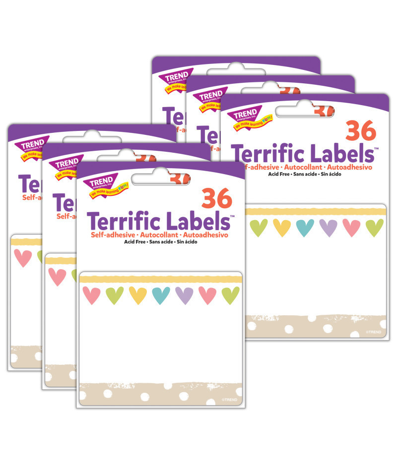 Bright and welcoming labels are acid free and designed for no-smear writing with markers or pens. Perfect for name tags, labels stay put and won't leave residue on clothes! Also great for cubbies, lockers, storage boxes, envelopes, learning centers, and so much more. Self-adhesive. Measures 2 1/2" x 3". Each pack includes 36 labels. Sold as 6 packs for a total of 216 labels.
