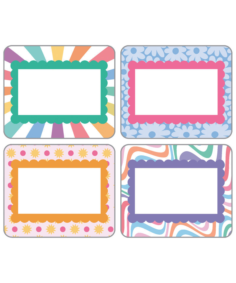 Add some retro vibes to your back to school teacher supplies and classroom décor with Retro Remix Name Tags! The name tag set includes 40 self-adhesive name stickers that feature 4 colorful, groovy designs and 10 name tags per design. Each name tag measures 3" x 2.5"—the perfect size name tags for classroom cubbies, student name tags for desks, lockers, and tags for labeling school supplies and daycare essentials. Use the name tags as name labels for field trips, back to school introductions with students, or back to school nights and parent teacher conferences. Retro Remix, designed by Stephanie and Loreal of @HappilyEverElementary, partnered with Carson Dellosa to bring some fun, retro vibes to your learning environment.
