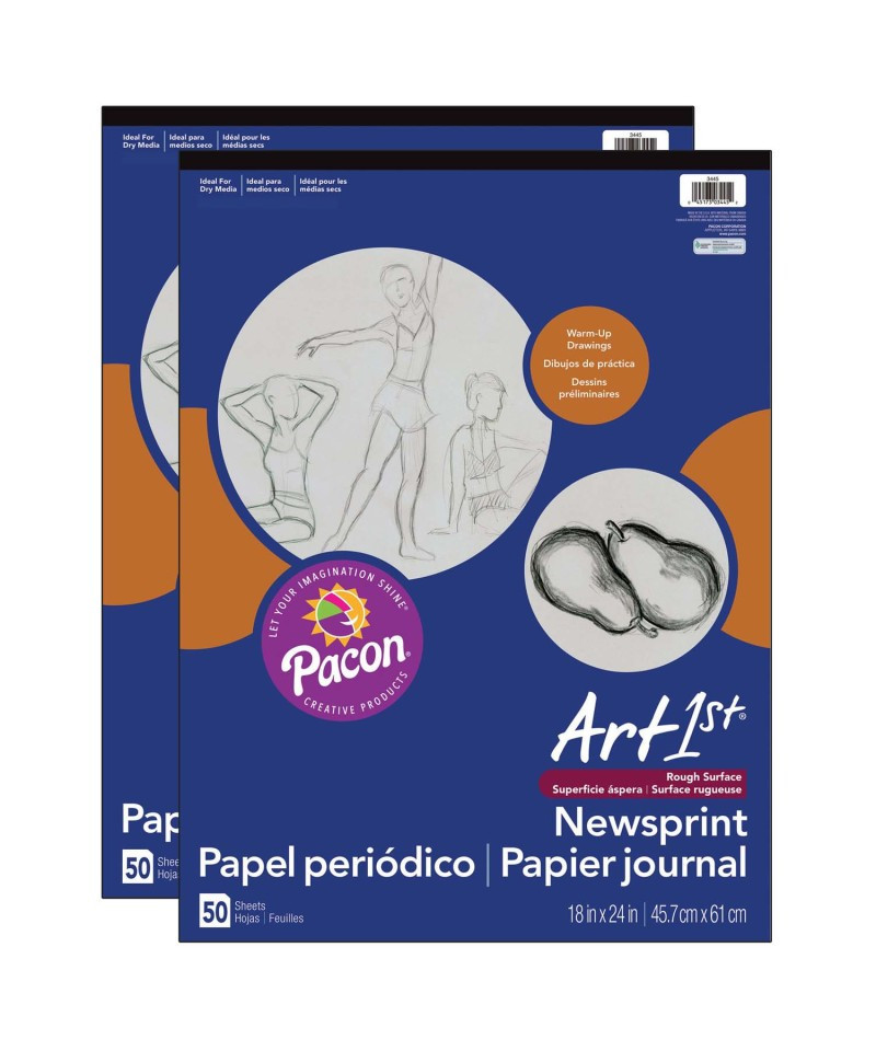 Standard grade, high bulk White newsprint paper in a pad. Perfect for gesture and preliminary drawings, and has a versatile rough surface. Includes 50 sheets per pad. Measures 18" x 24". Sold as 2 pads.