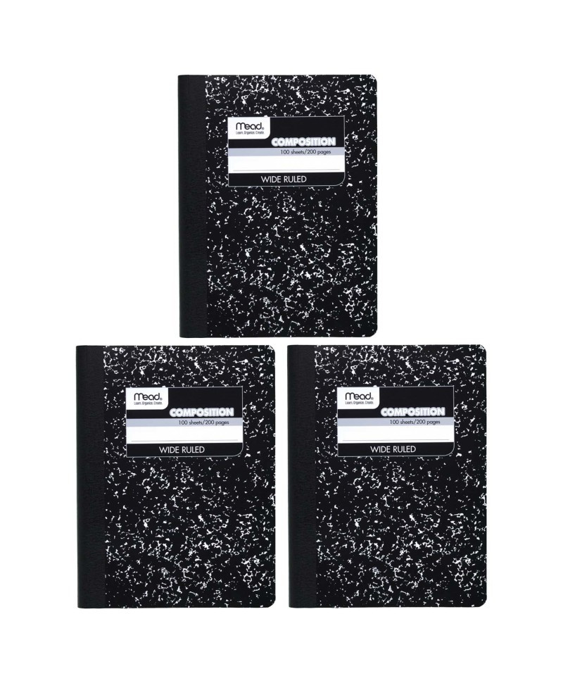 Mead Black Marble Composition Books are an old favorite with wide ruling that gives you plenty of space for writing. Features reference pages on the inside of both the front and back covers. Mead Black Marble Composition Book has 100 sheets for all your notetaking needs. Wide ruled white paper gives you plenty of space for writing. Class schedule on the inside front cover for easy scheduling. Multiplication tables, conversion tables and grammar rules on the inside back cover for quick reference. Composition book is durable with smooth, sewn binding that keeps pages permanently bound. Header of the front cover allows you to name or number each one. Page size is 9 3/4" x 7 1/2". Black marble cover. Sold as a pack of 3.