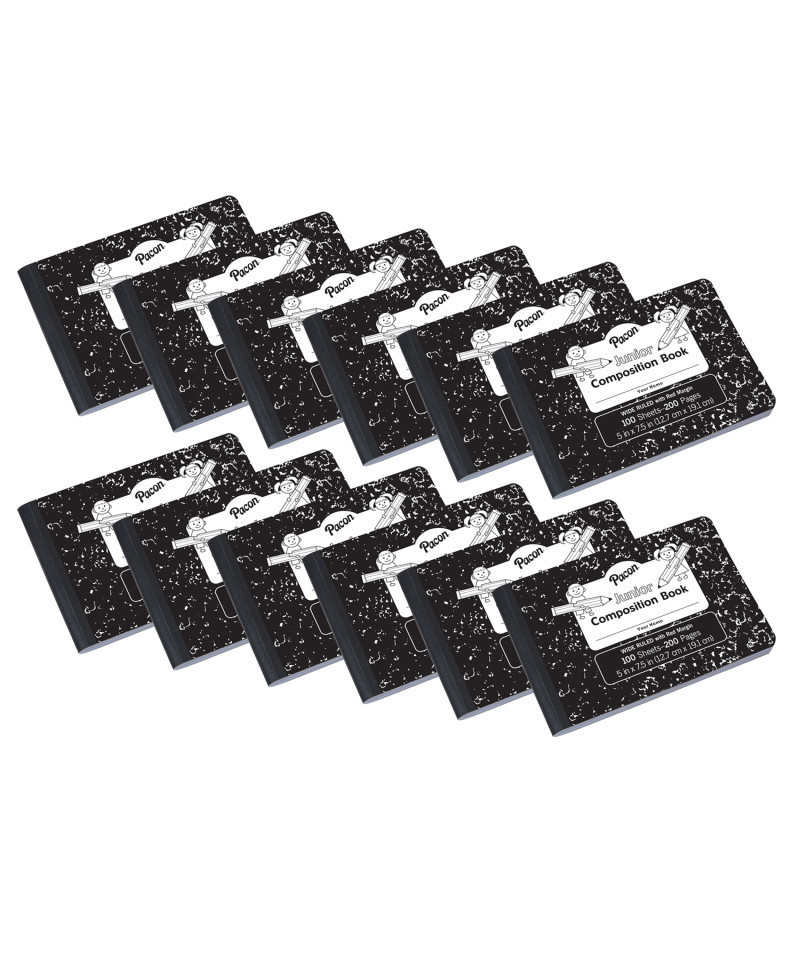 The Pacon® Junior Composition Book is a 5" x 7-1/2" composition book that is great for students to use for daily grammar and vocabulary work, practicing math word problems or as a class journal. The smaller size helps students fill the entire page for each lesson - no more wasted or empty space on full size pages! Comes with a hardcover for added durability in a Black marble design. Wide ruled. Includes 100 sheets in each book. Sold as a pack of 12 books.