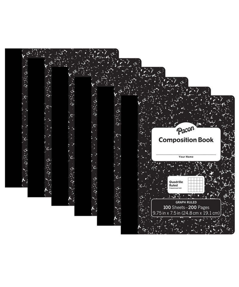 This Hard Cover one-subject composition book is great for drawing graphs, illustrations and more during note taking and journaling. Each sheet is 1/5" quadrille/grid ruled on both sides. Each composition book measures 9-3/4"H x 7-1/2"W with 100 sheets and 200 pages. Recyclable. Sold as a pack of 6 books.