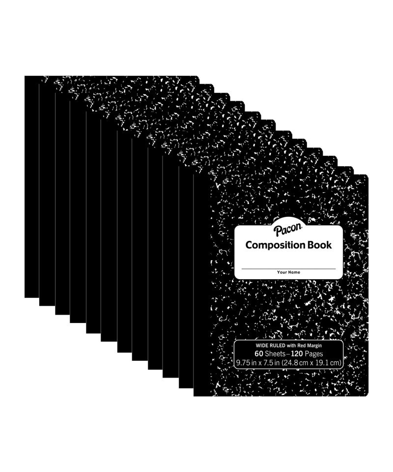 Black marble, hard cover composition book with 60 sheets to meet your needs. Sheets are wide ruled (3/8" ruled) and contain a red margin to help keep your notes neat. Great for note taking and journaling. Recyclable. Measures 9.75" x 7.5". Sold as a pack of 12 books.
