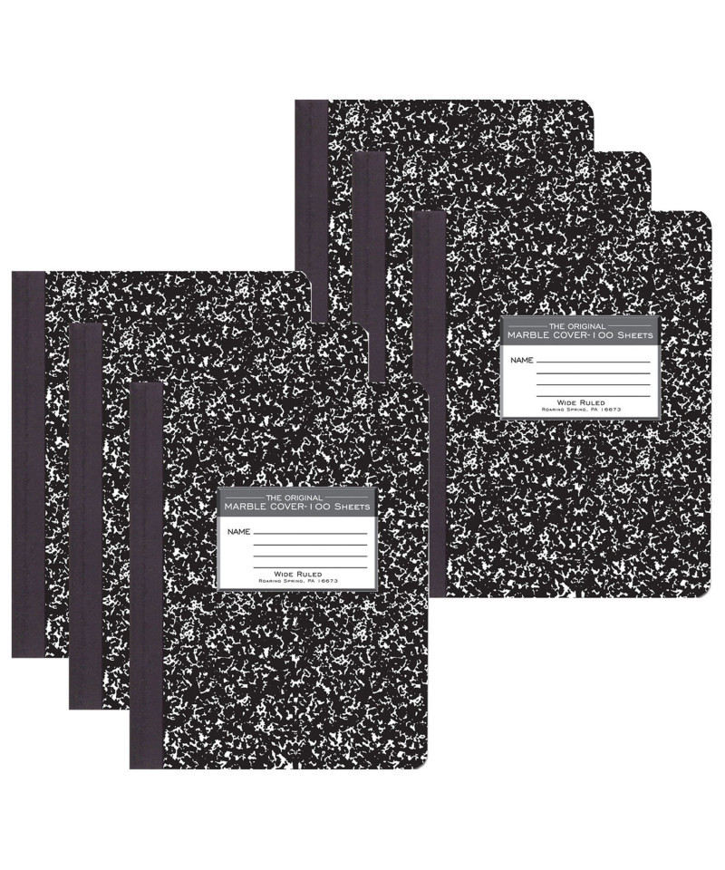Record your notes in this permanently bound composition book. Paper is smooth 15lb writing paper with wide ruled blue lines and a red margin line. Covers are a hard white board that are printed in the traditional black marble pattern. Inside of covers is printed with class schedule and other useful information. Each book is produced with center-sewn and tape bound construction, not designed for sheet tear-out. Sheet size is 9.75" x 7.5" and there are 100 sheets per book. Sold as a pack of 6 books. Proudly made in USA!