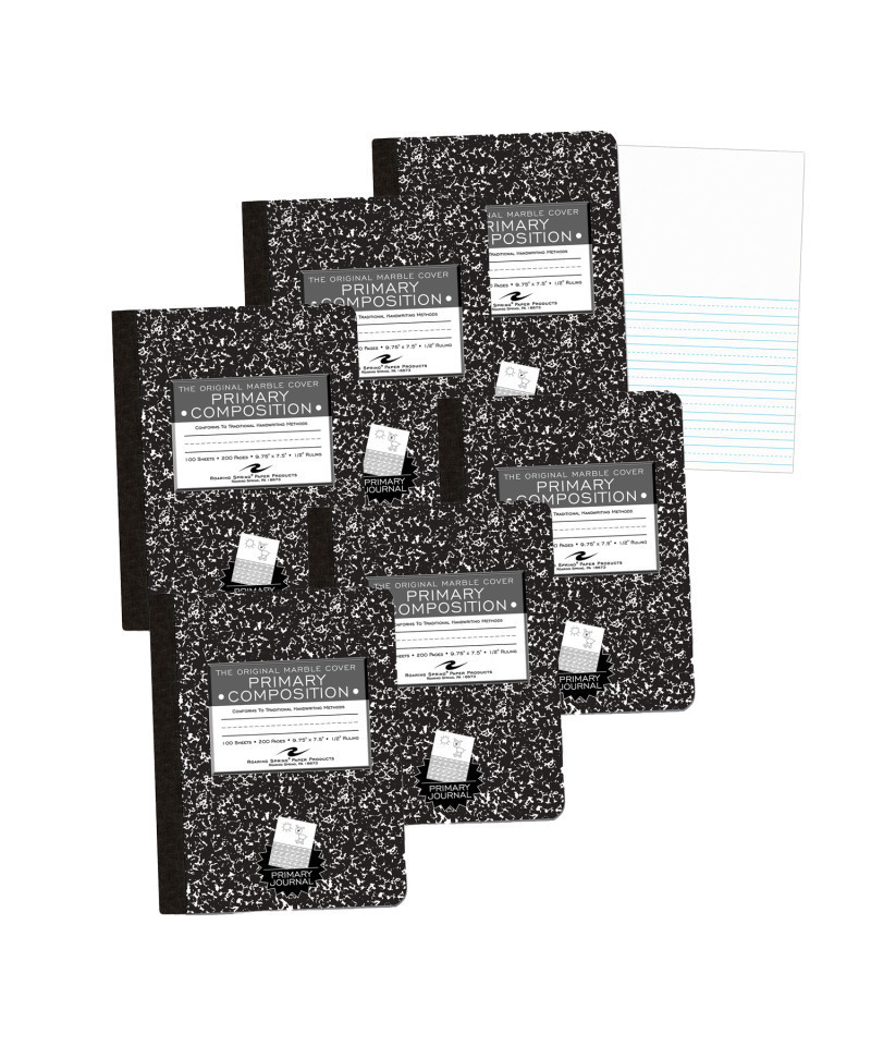 Teach students to use their imagination with this permanently bound composition book. Paper is smooth 15lb. writing paper with a blank upper half of each sheet, and grade 2 skip-line ruling on the bottom half. Design is intended for a sketch on top and a story about the sketch on the bottom Covers are a hard white board that are printed in the traditional black marble pattern. Inside of covers is printed with class schedule and other useful information. Each book is produced with center-sewn and tape bound construction, not designed for sheet tear-out. Sheet size is 9.75" x 7.5" and there are 100 sheets per book. Proudly made in USA! Sold as a pack of 6 books.