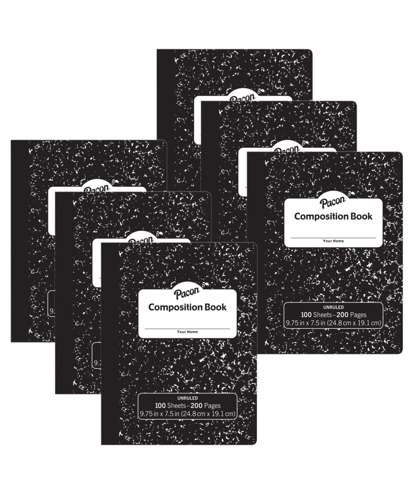 Black marble, hard cover composition book with 100 sheets to meet your needs. Sheets are unruled giving you all the space you need to draw and annotate. Great for drawing, note taking and journaling. Recyclable. Measures 9-3/4" x 7-1/2". Sold as a pack of 6 composition books.