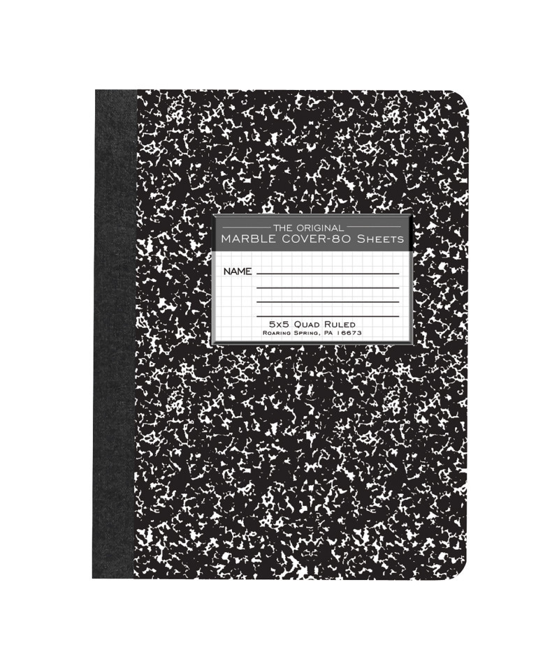 Record your notes in this permanently bound composition book. Paper is smooth 15# writing paper printed with a 5x5 graph grid pattern. Covers are a hard white board that are printed in the traditional black marble pattern. Inside of covers is printed with class schedule and other useful information. Each book is produced with center-sewn and tape bound construction, not designed for sheet tear-out. Sheet size is 9.75" x 7.5" and there are 80 sheets per book. Proudly made in USA!