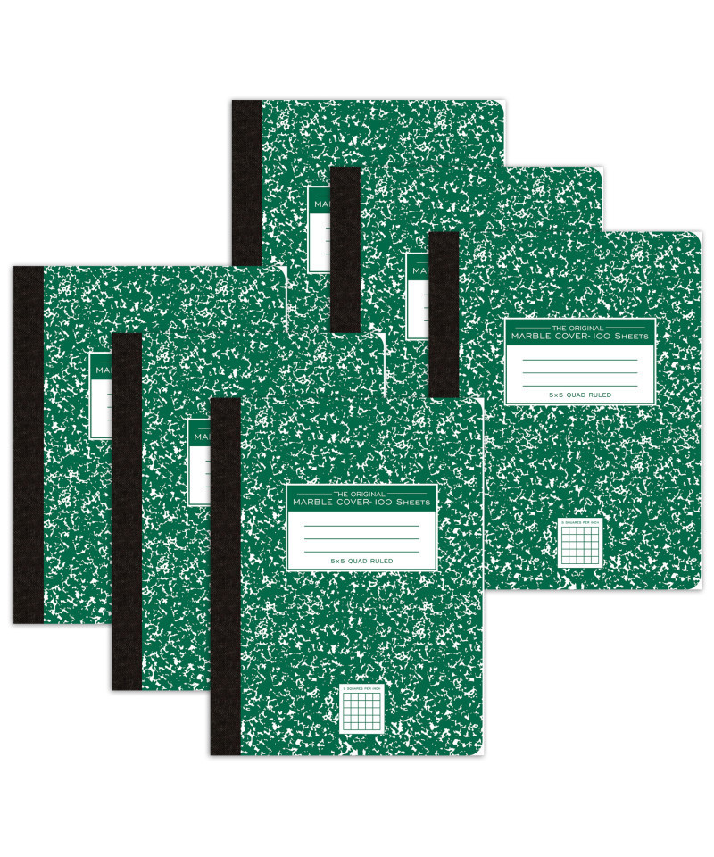 Record your notes in this permanently bound composition book. Paper is smooth 15# writing paper printed with a 5x5 graph grid pattern. Covers are a hard white board that are printed in the traditional green marble pattern. Inside of covers is printed with class schedule and other useful information. Each book is produced with center-sewn and tape bound construction, not designed for sheet tear-out. Sheet size is 9.75" x 7.5" and there are 100 sheets per book. Made in Sri Lanka. Sold as a pack of 6 composition books.
