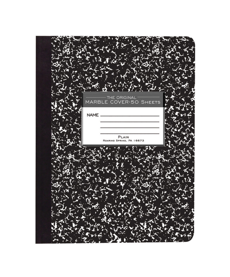 Record your notes in this permanently bound composition book. Paper is smooth 15# writing paper that is plain-no ruled lines of any kind. Great for sketches! Covers are a hard white board that are printed in the traditional black marble pattern. Inside of covers is printed with class schedule and other useful information. Each book is produced with center-sewn and tape bound construction, not designed for sheet tear-out. Sheet size is 9.75" x 7.5" and there are 50 sheets per book. Proudly made in USA!