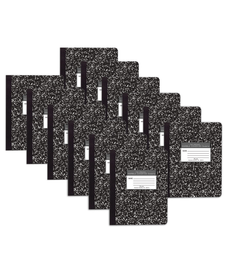 Record your notes in this permanently bound composition book. Paper is smooth 15# writing paper that is plain-no ruled lines of any kind. Great for sketches! Covers are a hard white board that are printed in the traditional black marble pattern. Inside of covers is printed with class schedule and other useful information. Each book is produced with center-sewn and tape bound construction, not designed for sheet tear-out. Sheet size is 9.75" x 7.5" and there are 50 sheets per book. Proudly made in USA! Sold as a pack of 12 composition books.