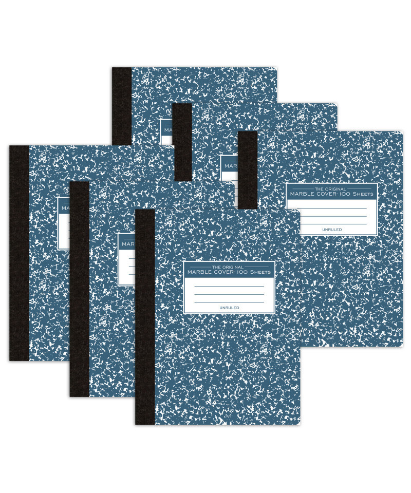 Record your notes in this permanently bound composition book. Paper is smooth 15# writing paper that is plain-no ruled lines of any kind. Great for sketches! Covers are a hard white board that are printed in the traditional blue marble pattern. Inside of covers is printed with class schedule and other useful information. Each book is produced with center-sewn and tape bound construction, not designed for sheet tear-out. Sheet size is 9.75" x 7.5" and there are 100 sheets per book. Proudly made in USA! Sold as a pack of 6 composition books.