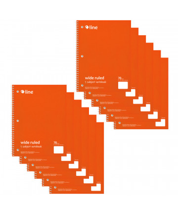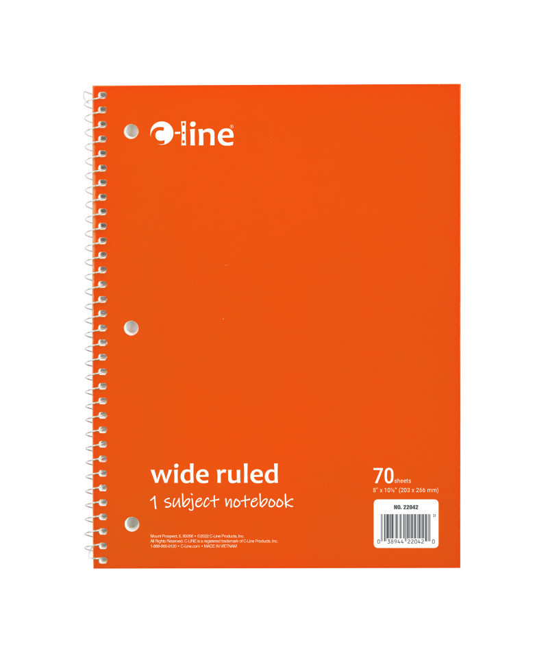 Instantly create writing space in binders and folders, by inserting the Spiral-Bound 1-Subject Notebook. Perfect for students and professionals, these notebooks feature a durable cover that helps protect the content written on the pages inside. Wide ruled format: the bright white paper has blue handwriting lines with a red margin divider to allow for neat writing. Solid colored front cover adds style to notebooks, while also making it easy to organize projects or classes by color. Attach this 3-hole punched spiral notebook into a standard 3-ring binder to create the ultimate organizational tool that keeps all your notes and hand-outs in one place. Perforated edges reduce paper waste by allowing pages to tear out neatly. 70-page spiral bound notebook. Colored front cover, gray board back cover. Orange. Sold individually.