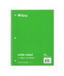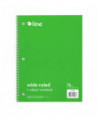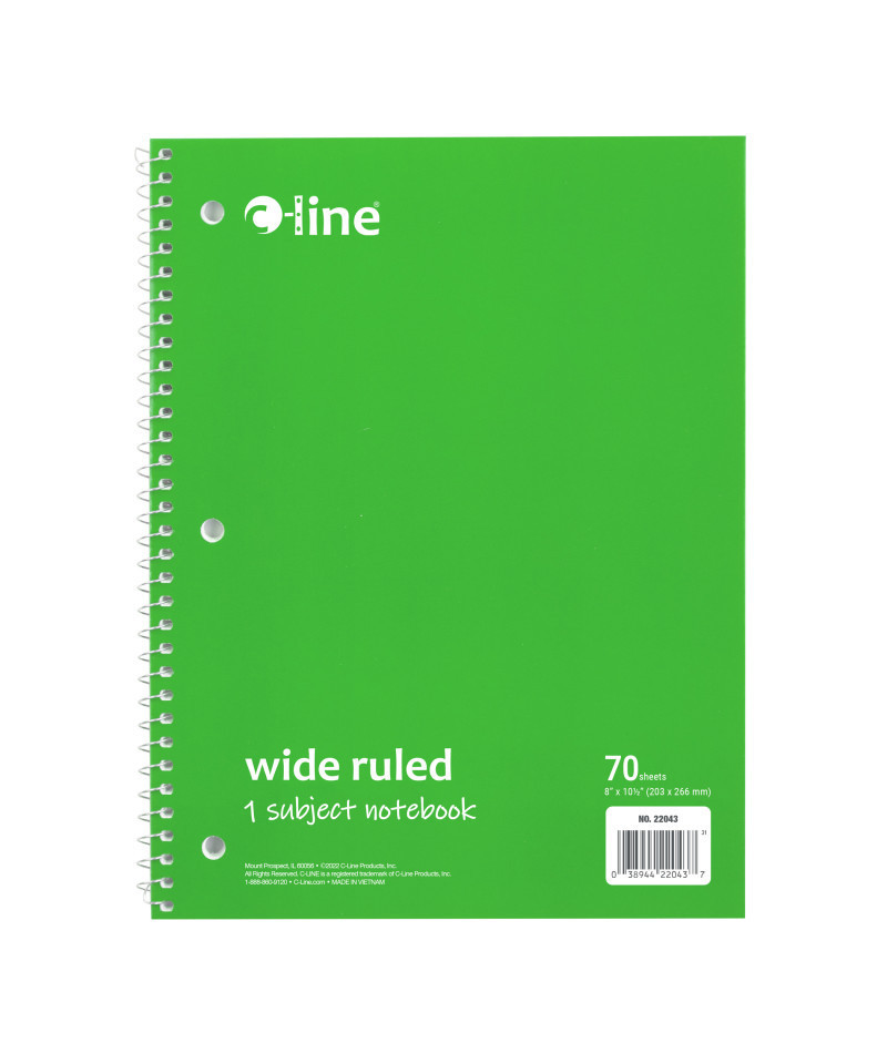 Instantly create writing space in binders and folders, by inserting the Spiral-Bound 1-Subject Notebook. Perfect for students and professionals, these notebooks feature a durable cover that helps protect the content written on the pages inside. Wide ruled format: the bright white paper has blue handwriting lines with a red margin divider to allow for neat writing. Solid colored front cover adds style to notebooks, while also making it easy to organize projects or classes by color. Attach this 3-hole punched spiral notebook into a standard 3-ring binder to create the ultimate organizational tool that keeps all your notes and hand-outs in one place. Perforated edges reduce paper waste by allowing pages to tear out neatly. 70-page spiral bound notebook. Colored front cover, gray board back cover. Green. Sold individually.