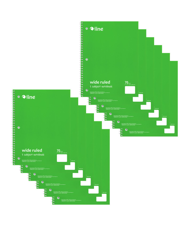 Instantly create writing space in binders and folders, by inserting the Spiral-Bound 1-Subject Notebook. Perfect for students and professionals, these notebooks feature a durable cover that helps protect the content written on the pages inside. Wide ruled format: the bright white paper has blue handwriting lines with a red margin divider to allow for neat writing. Solid colored front cover adds style to notebooks, while also making it easy to organize projects or classes by color. Attach this 3-hole punched spiral notebook into a standard 3-ring binder to create the ultimate organizational tool that keeps all your notes and hand-outs in one place. Perforated edges reduce paper waste by allowing pages to tear out neatly. 70-page spiral bound notebook. Colored front cover, gray board back cover. Green. Sold as a pack of 12.
