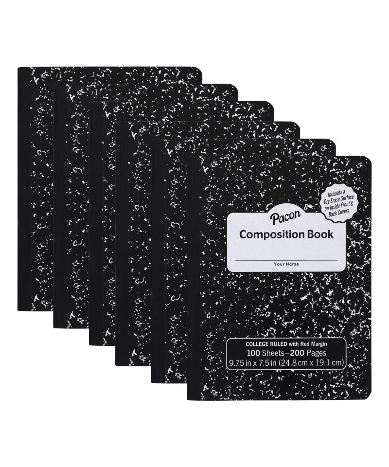 Organize your day, your thoughts, or just practice your lesson using the dry erase surfaces inside these new composition books. Two dry erase surfaces, located inside the front and back covers, provide exciting new ways for your student to learn, engage and have fun. These hard cover books come in black marble, with 100 sheets each. College (9/32") ruled with Red Margins. Recyclable. Sold as a pack of 6 books.