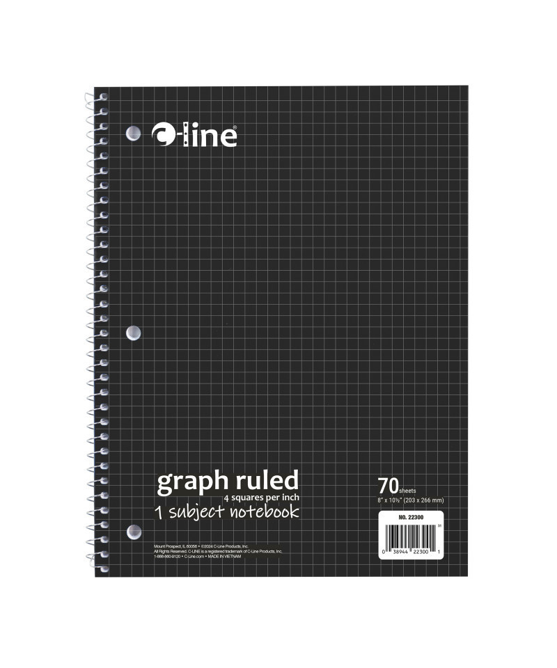 The Graph Ruled 1-Subject Notebook lets you create graphs, charts, drawing or simply take notes. 3-hole punch makes it easy to add to standard 3-ring binders. The 4 x 4 graph ruling provides a neat guide for your drawings and notetaking. Perfect for students and professionals, these notebooks feature a durable cover that helps protect the content written on the pages inside. Graph ruled format, bright white paper allows for neat drawing of charts and graphs. Solid colored front cover adds style to notebooks. Attach this 3-hole punched 1-subject notebook into a standard 3-ring binder to create the ultimate organizational tool that keeps all your charts and drawings in one place. Perforated edges reduce paper waste by allowing pages to tear out neatly. 70-sheet spiral bound notebook. Each sheet features four squares per inch. Black front cover, gray board back cover. Includes 1 notebook.