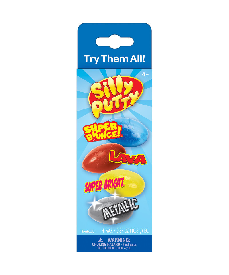- VARIETY PACK: Experience the joy of play and creativity with the Silly Putty 4ct Specialty Pack from Crayola. This set includes four unique specialty eggs: Superbounce (blue), Lava (orange), Superbright (yellow), and Metallic (silver).
