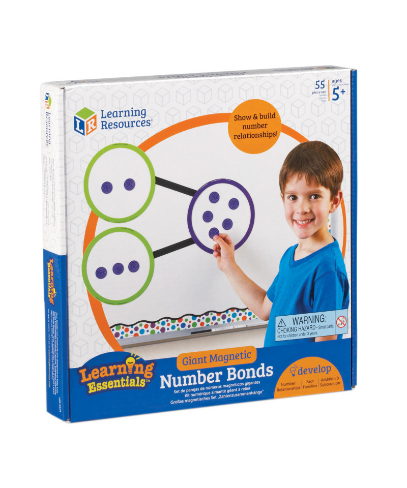 Easily demonstrate number relationships on the whiteboard! colorful, magnetic circles, squares, and counters are designed to demonstrate fact family and part-part-whole relationships for the entire class. Great way to build addition and subtraction skills. This comprehensive set includes 3 Circle and 3 square number bonds (8" and 9-1/2" in diameter, respectively), 4 connecting lines, and 45 magnetic counters measuring 1-1/4" each.