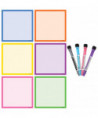 Six colorful write-on/wipe-off notes. Each note measures 5.425" x 5.425". Includes 4 dry-erase pens in black, blue, pink, and purple. Use on refrigerators, whiteboards, lockers, metal desks, metal shelves and more.