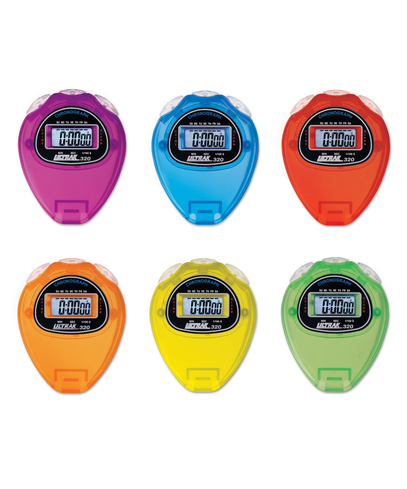The ULTRAK 320 Rainbow Set is a practical and engaging timing solution for schools, PE programs, and office environments that benefit from group coordination. Each stopwatch in the set features a large, easy-to-read display and provides a clear readout of cumulative splits, ideal for tracking time in various classroom activities, group challenges, or team-based office tasks. With a 24-hour timing capacity, these stopwatches can handle both short intervals and extended sessions with ease. In addition to stopwatch functionality, each unit includes time, calendar, alarm, and hourly chime functions, offering everyday utility beyond event timing. The set includes six color-coded stopwatches, allowing for easy group assignment and organization. Complete with lanyards and backed by a three-year warranty, the ULTRAK 320 Rainbow Set is built for convenience, durability, and daily use.
