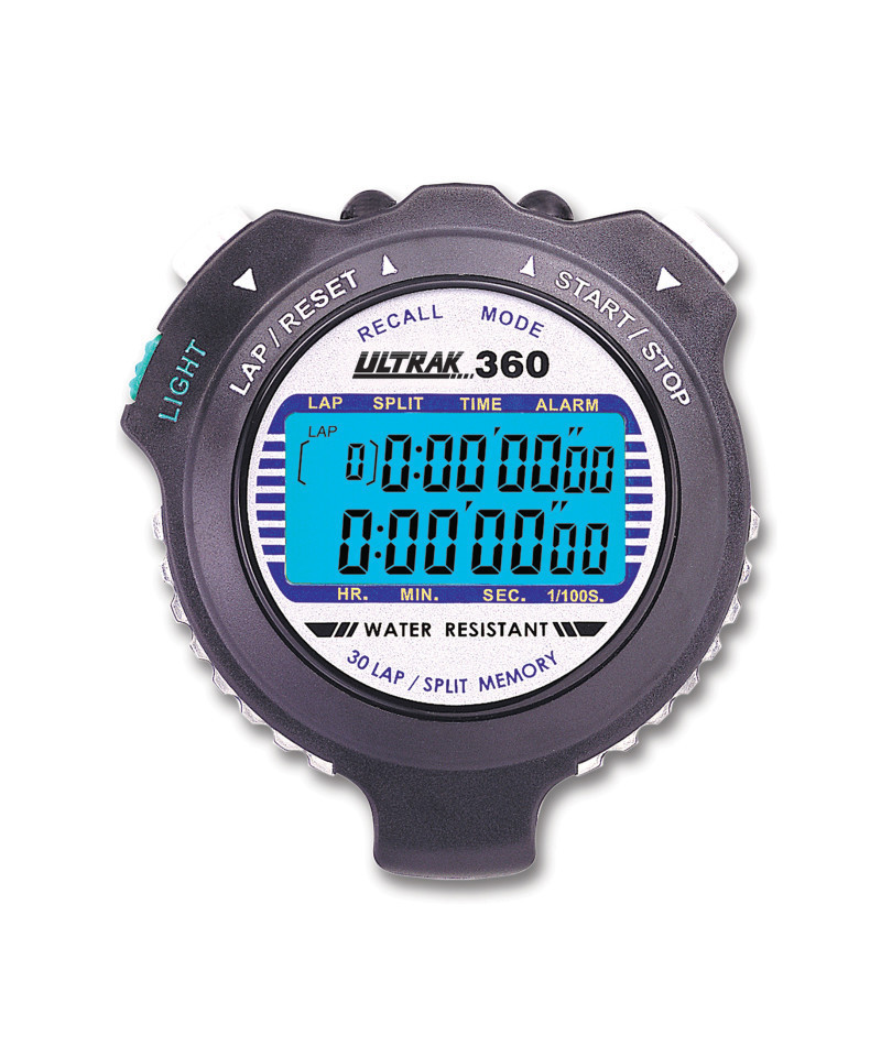 The ULTRAK 360 is a dependable and easy-to-use stopwatch designed specifically for physical education and school sports programs. It features 30 dual split recallable memory, allowing teachers to review multiple performances during or after an activity. The stopwatch records both lap and cumulative splits, and lets you scroll through results forward or backward for convenient access to timing data. Its continuous display of running event time ensures that instructors can monitor progress in real time. The large two-row display with electro-luminescent backlight makes it easy to read in all lighting conditions, whether indoors or outdoors. With the ability to measure up to 10 hours, it's ideal for everything from quick drills to long-form endurance tests. The ULTRAK 360 also includes time, alarm, and calendar functions, plus a lanyard for convenient use throughout the school day.