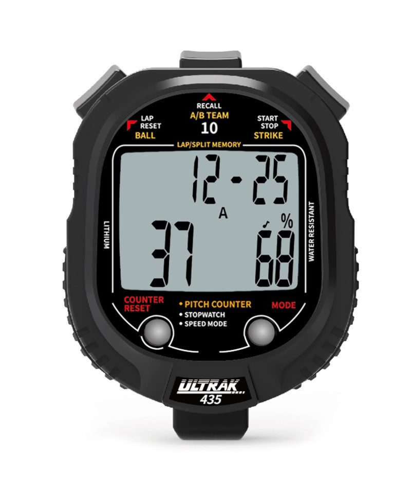 The ULTRAK 435 is a multifunctional tool built for accuracy, versatility, and ease of use in schools, physical education settings, and even office environments. It features a two-line display that tracks balls, strikes, total pitches, and strike percentage for two pitchers—perfect for baseball and softball programs. In addition to pitching stats, the 435 can be adapted to track success rates in other sports like basketball (field goal percentage) or football (completion percentage). It includes a dual-mode 10-memory stopwatch that supports both dual split timing (lap and cumulative) and single-event timing with a lap counter up to 99. With pitch speed calculation, educators and coaches can assess player performance without additional tools. Its water-resistant design, sound control, and automatic power shut-off make it a durable and practical choice for daily use in PE classes and beyond.