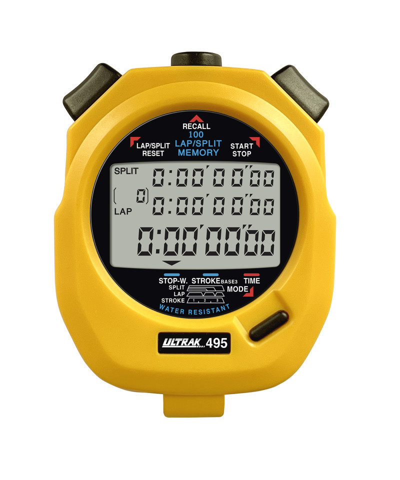 The ULTRAK 495 is one of the best-selling stopwatches in education and physical education thanks to its durability, simplicity, and powerful features. It offers 100 dual-split recallable memory, allowing teachers and coaches to track and review multiple athletes' performances with ease. The large three-row display shows split time, lap time, and either running event or lap time on the bottom row, making it easy to monitor progress in real time. Users can recall times during operation and even take new splits while reviewing results, ideal for fast-paced PE classes and school meets. The stroke/frequency function is especially useful for swim instruction or pacing drills. With a ten-hour timing range, calendar and time display, and water-resistant housing, it's built for reliable use across indoor gyms, fields, and pools. Backed by a five-year warranty, the ULTRAK 495 is a trusted, go-to stopwatch for educators nationwide.