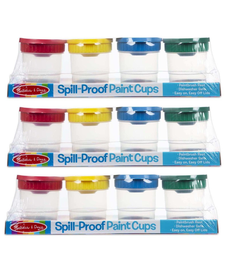 Colorful lids keep paint where it belongs! A set of 4 dishwasher-safe cups feature brush holders to keep paint from spilling and snap-on storage lids to keep paint fresh. Sold as 3 sets for a total of 12 paint cups.