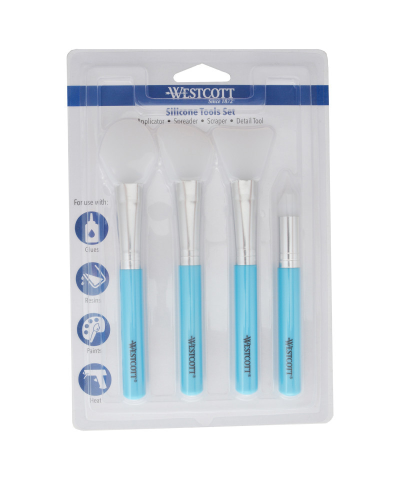Creating your next masterpiece is easy when you have the very best tools to work with. This 4-piece set includes essential silicone accessories for DIY projects using paints, resins or hot glue guns. Silicone tips only are heat resistant to 400°F. Hand wash with mild soap and water. Includes applicator, spreader, scraper and detail tool.