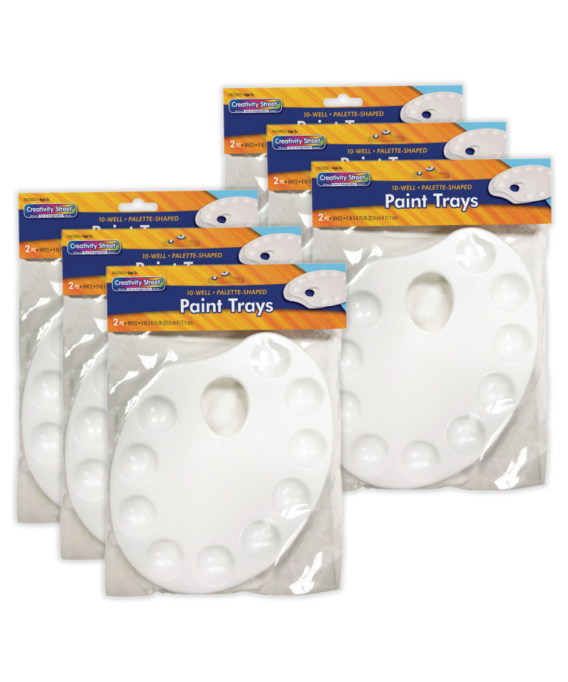 Durable white plastic trays with 10 paint wells each, these Creativity Street® palette-shaped trays glow under black light! Great for arts and crafts activities. Each pack contains 2 trays for multiple artists. Sold as 6 packs for a total of 12 trays.