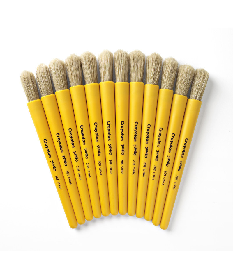 The Crayola Jumbo Brush features a plastic handle, and is ideal for painting large areas or making broad strokes with its natural bristles. Crayola art supplies and activities help children express, create, and connect through colorful play. This brush style is easy for young artists to handle and hold, and works with a variety of paint. White bristle hair - Round head. Pack of 12 paint brushes.
