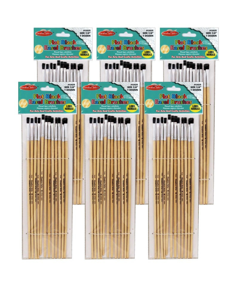 Fine grade natural black bristles. Seamless polished aluminum ferrules are double crimped to handles. Natural hardwood handles feature lacquered finish. Each individual set contains 12 Brushes. Sold as 6 sets for 72 Brushes total.
