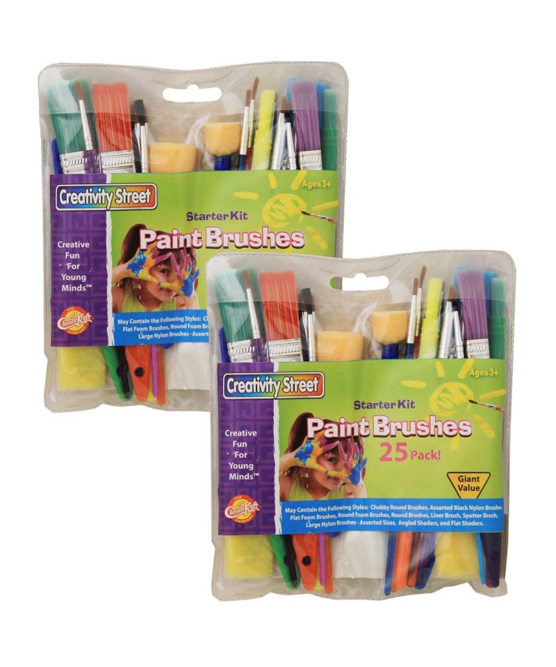 A terrific starter set of 25 brushes in a great variety of sizes and shapes from small to large, bristles to foam. This set of brushes work well with all types of paint media. Set includes tapered round tip art/black bristle round art brushes and is suitable for children of age 4 - 6 years. Also includes tapered round tip art brushes and black bristle round art brushes. Includes flat top art sponges, wedge tip sponges, 1" painters, flat tip brushes, round brushes, art brushes and flat angle tip art brushes. An assortment of 25 brushes and sponges in different sizes. Bristle width: 1/16", 1/8", 1/4", 3/16", 3/8", 1/2", 5/8", 3/4", 1". Brush profile: Angled flat, flat, round. Sold as 2 packs, 50 brushes total.