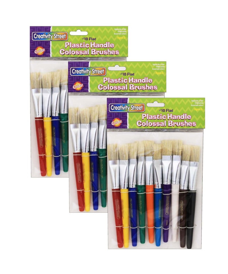 Short handles are great for small hands. Short handle brushes with flat natural white hog bristles and aluminum ferrules. Each set contains 10 brightly assorted flat brushes that match our 10 Assorted No-Spill Paint Cups which will aid in teaching children color recognition. Sold as 2 sets, 20 brushes total.