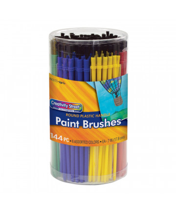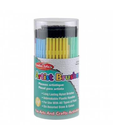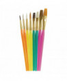 Contains eight different brushes with brightly colored, translucent plastic handles that can be used with watercolor, oil, tempera and acrylic paints. The round brushes are great for details and the flat brushes are good for large areas and edging for fine lines.