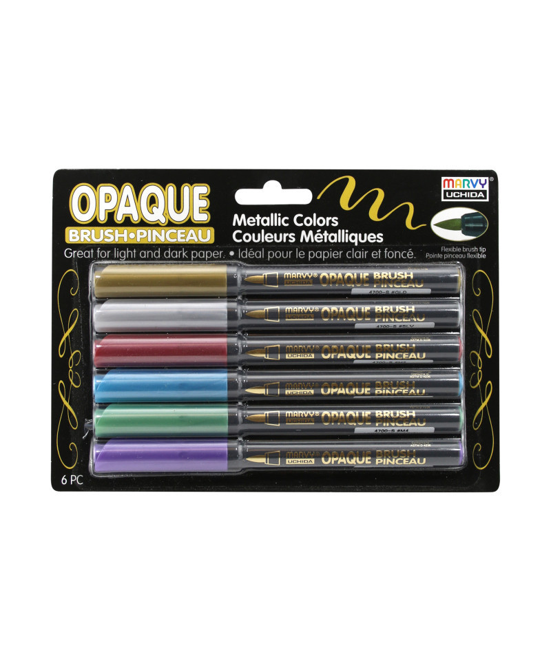 Great for hand lettering, brush lettering, planners, journals and more. The specialized brush tip allows you to easily create thick and thin strokes on both light and dark paper. Each pack includes 6 markers: gold, silver, metallic red, metallic blue, metallic green, and metallic violet.