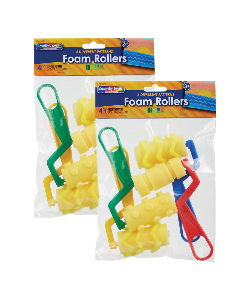 Watch their imagination run wild as they find new ways to incorporate paint foam rollers into their paint projects. Durable foam brushes are easy to store and clean. Easy-to-grip handles have built-in storage loops for hanging. Each pack includes 4 rollers in 4 distinct patterns kids are sure to love including: Zig Zags, Waves, Dots, and Stripes patterns. Sold as 2 packs for a total of 8 rollers.