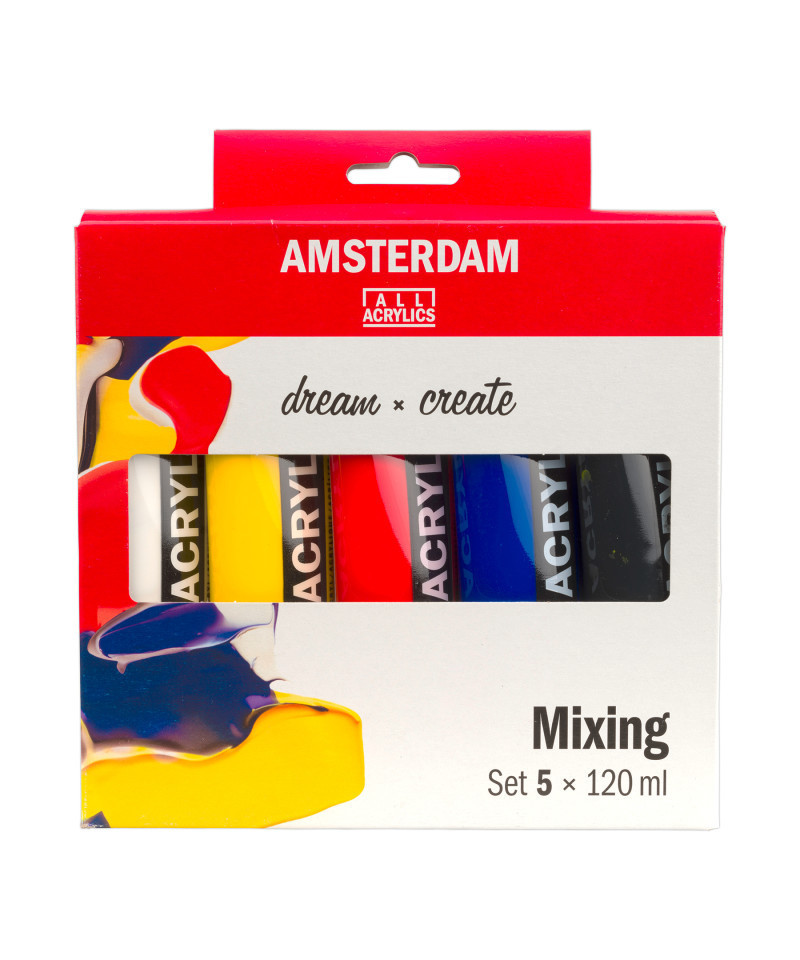 Amsterdam Standard Series Acrylic offers you the broadest range of remarkably vibrant acrylic colors. This versatile paint is easy to work with and offers a smooth application. Use the paint straight from the tube or thinned with a little bit of water or one of our acrylic mediums. This set provides you with 5 great basics in large tubes: Titanium White, Oxide Black and three warm mixing colors – Azo Yellow Light, Naphthol Red Medium and Ultramarine.