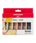 Amsterdam Standard Series Acrylic offers you the broadest range of remarkably vibrant acrylic colors. This versatile paint is easy to work with and offers a smooth application. Use the paint straight from the tube or thinned with a little bit of water or one of our acrylic mediums. This set contains one tube each of Silver, Light Gold, Deep Gold, Copper, Bronze, and Graphite.