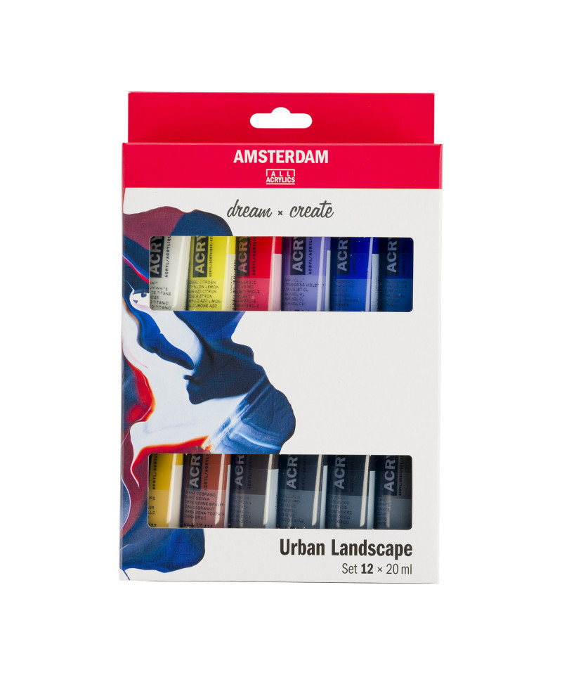 Amsterdam Standard Series Acrylic offers you the broadest range of remarkably vibrant acrylic colors. This versatile paint is easy to work with and offers a smooth application. Use the paint straight from the tube or thinned with a little bit of water or one of our acrylic mediums. Colors in the set include Titanium White #105, Azo Orange #276, Pyrrole Red #315, Ultramarine Violet Light #519, Ultramarine #504, Phthalo Blue #570, Yellow Ochre #227, Burnt Sienna #411, Vandyke Brown #403, Payne's Grey #708, Oxide Black #735, Graphite #840.