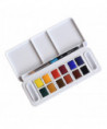 Since 1783, Daler-Rowney has inspired professional artists, art students and hobbyists to embrace their creativity. We believe in producing art supplies that are sustainable, qualitative, durable, accessible and affordable. Aquafine watercolor paint makes creating watercolor art easier than ever. Whether you're a professional artist, a beginner working on your techniques, or somewhere in between, this Aquafine set will help you express your creative vision. Milled to perfection in every batch, Aquafine watercolor paints are free-flowing and vibrant. Each color is crafted from high-quality organic pigments with no fillers resulting in rich, transparent color. The milling process produces a smooth paint formula that offers optimal performance, magnificent control and a superior painting experience. Unrivaled in their category, these colors flow effortlessly over watercolor paper, canvases, and other suitable mediums. Simply wet the paint with water to activate it and begin your creative journey. The paint has excellent lightfastness for archival quality, so when you’re finished creating your works will last, remaining vivid and beautiful for years to come. If you're looking for affordable professional-grade watercolor paints in a wide variety of shades, look no further. Aquafine watercolors make quality and performance more accessible than ever. Half Pan Travel Set includes 12 colors and a brush in a cover.