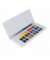 Since 1783, Daler-Rowney has inspired professional artists, art students and hobbyists to embrace their creativity. We believe in producing art supplies that are sustainable, qualitative, durable, accessible and affordable. Aquafine watercolor paint makes creating watercolor art easier than ever. Whether you're a professional artist, a beginner working on your techniques, or somewhere in between, this Aquafine set will help you express your creative vision. Milled to perfection in every batch, Aquafine watercolor paints are free-flowing and vibrant. Each color is crafted from high-quality organic pigments with no fillers resulting in rich, transparent color. The milling process produces a smooth paint formula that offers optimal performance, magnificent control and a superior painting experience. Unrivaled in their category, these colors flow effortlessly over watercolor paper, canvases, and other suitable mediums. Simply wet the paint with water to activate it and begin your creative journey. The paint has excellent lightfastness for archival quality, so when you’re finished creating your works will last, remaining vivid and beautiful for years to come. If you're looking for affordable professional-grade watercolor paints in a wide variety of shades, look no further. Aquafine watercolors make quality and performance more accessible than ever. Half Pan Travel Set includes 24 colors and a brush in a cover.
