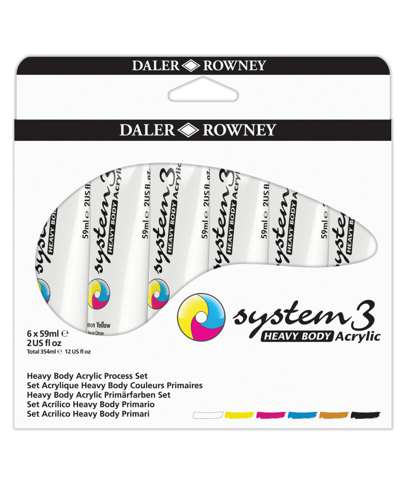 Since 1783, Daler-Rowney has inspired professional artists, art students and hobbyists to embrace their creativity. Daler-Rowney System3 Acrylics are highly versatile water-based acrylic colors. Made from high quality pigments, their superior pigment loading allows for them to be thinned with water to create pale washes or used directly from the tube to form an insoluble film. The fast drying properties of System3 enables artists to work quickly, superimposing or juxtaposing colors with ease. The comprehensive range of colors offers excellent lightfastness, ranking 3 to 4 stars for most colors, permanence, intermixability, durability, and covering power. Suitable for both indoor and outdoor use, System3 Acrylic can be easily applied onto traditional fine art surfaces such as canvas, paper, and board, as well as wood, textile, plastic and murals. Its unique flow formula is ideal for large scale art installations as well as studio projects. This set includes (6) 59ml tubes of paint: Mars Black, Titanium White, Cadmium Yellow Hue, Cadmium Red Hue, Ultramarine, and Burnt Sienna.