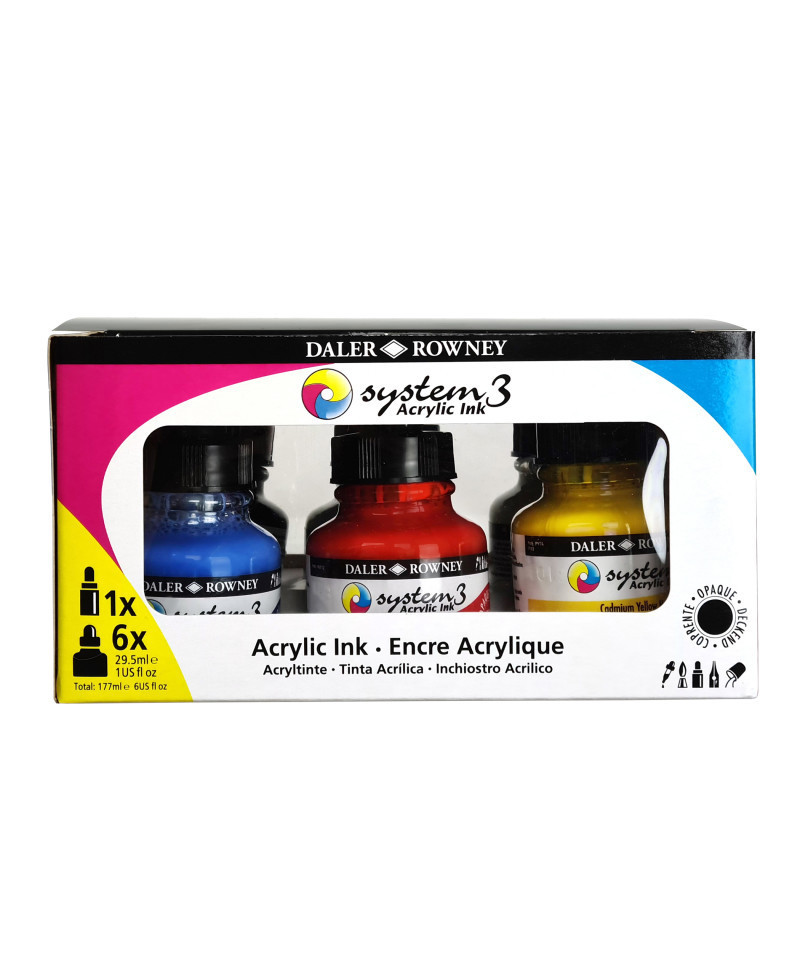 Since 1783, Daler-Rowney has inspired professional artists, art students and hobbyists to embrace their creativity. Daler-Rowney System3 Acrylics are highly versatile water-based acrylic colors. Made from high quality pigments, their superior pigment loading allows for them to be thinned with water to create pale washes or used directly from the tube to form an insoluble film. The fast drying properties of System3 enables artists to work quickly, superimposing or juxtaposing colors with ease. The comprehensive range of colors offers excellent lightfastness, ranking 3 to 4 stars for most colors, permanence, intermixability, durability, and covering power. Suitable for both indoor and outdoor use, System3 Acrylic can be easily applied onto traditional fine art surfaces such as canvas, paper, and board, as well as wood, textile, plastic and murals. Its unique flow formula is ideal for large scale art installations as well as studio projects. Each set includes an empty marker and (6) 29.5ml bottles of Acrylic Ink: Cadmium Yellow Hue, Cadmium Red Hue, Ultramarine Blue, Titanium White, Silver Imit, and Mars Black.
