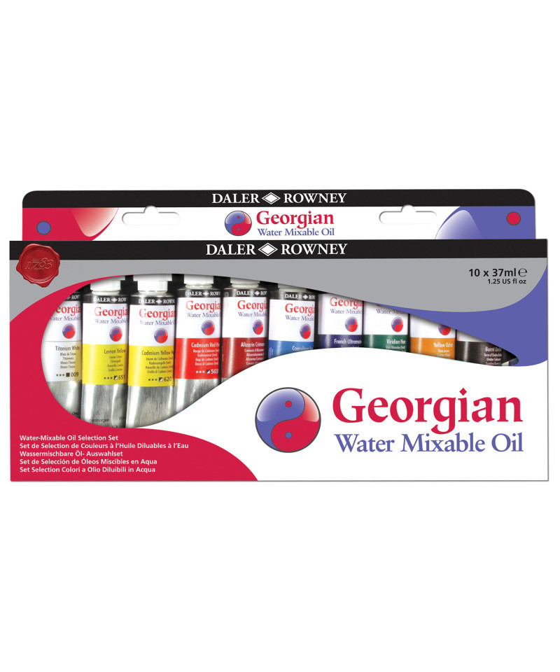 Discover a new dimension in oil painting with Georgian Water Mixable Oil Colors—where the rich, traditional experience of oil painting meets modern convenience. This versatile range of vibrant hues eliminates the need for solvent-based mediums, allowing you to achieve stunning effects with just water. Perfect for both studio and classroom settings, these colors boast high lightfastness, robust pigment load, and exceptional durability. Their smooth, creamy texture mimics traditional oils, making them ideal for impasto techniques, while thinning with water allows for delicate wash effects akin to watercolor. With a drying time of 5 to 7 days and no color shift from wet to dry, these oils ensure consistent results. Clean-up is a breeze with just soap and water. Compatible with typical oil surfaces—canvas, gesso-treated paper, and wood—Georgian Water Mixable Oils empower your creativity with ease and flexibility. Since 1783, Daler-Rowney has inspired professional artists, art students & hobbyists to embrace their creativity. We believe in producing art supplies that are sustainable, qualitative, durable, accessible & affordable. Includes 10 tubes of paint: Titanium White, Lemon Yellow, Cad Yellow Hue, Cad Red Hue, Alizarin Crimson Hue, Coeruleum Hue, French Ultramarine, Viridian Hue, Yellow Ochre, & Burnt Umber.