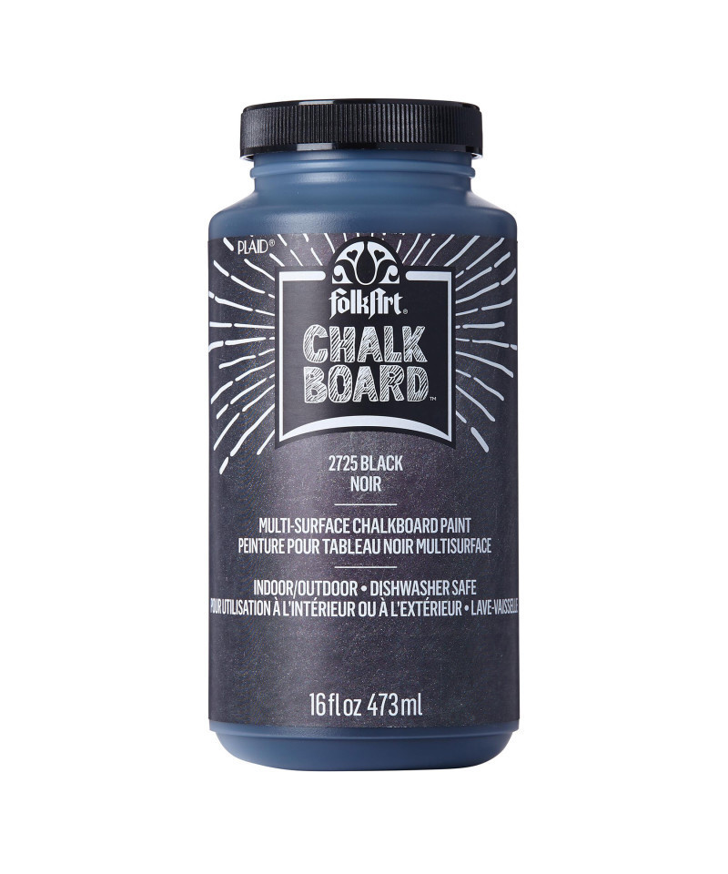 Now you can create a custom chalkboard surface on all your projects with the FolkArt Chalkboard Paint. This chalkboard paint is great for decorating furniture, home decor, gifts, and more. Use on a variety of surfaces such as wood, terra cotta, metal, and many other surfaces that need a personal touch. With this easy-to-use formula, simply brush on, let dry, and condition with chalk. Add the FolkArt Chalkboard Paint to your art supplies to give all your projects a touch of creativity.