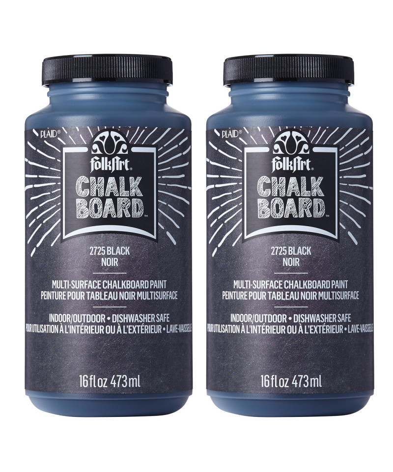 Now you can create a custom chalkboard surface on all your projects with the FolkArt Chalkboard Paint. This chalkboard paint is great for decorating furniture, home decor, gifts, and more. Use on a variety of surfaces such as wood, terra cotta, metal, and many other surfaces that need a personal touch. With this easy-to-use formula, simply brush on, let dry, and condition with chalk. Add the FolkArt Chalkboard Paint to your art supplies to give all your projects a touch of creativity. Sold as a pack of 2.
