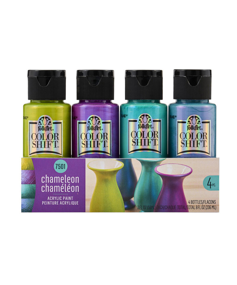 - VERSATILE & CONVENIENT SIZE - This lustrous acrylic paint kit includes 4 - 2 oz bottles of metallic craft paint. The colors in the kit include: FolkArt Color Shift Green Flash, Aqua Flash, Blue Flash, and Purple Flash