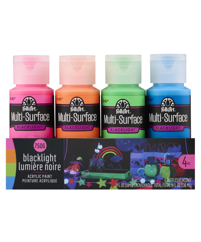The FolkArt Multi-Surface Neon Glow Acrylic Paint Set will give your projects a flashy touch of bold color. Each acrylic paint color in this four-piece set is bursting with rich, vibrant hues that have a thick and creamy texture for smooth brush strokes and extraordinary blending and shading. Use this water-based, non-toxic formula on wood, canvas, tin, terra cotta, fabric, and more. The artist-quality of this bright, premium acrylic paint will set your crafts apart from the rest. Use this versatile acrylic paint with any acrylic paint brushes, stamps, stencils, and sponges for an extraordinary finish. Add the FolkArt Multi-Surface Neon Glow Acrylic Paint Set to your next project with this vivid acrylic paint as part of your art supplies.