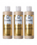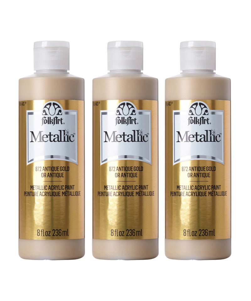 Add some shimmer to your next DIY project with FolkArt Metallic Acrylic Paint. This acrylic paint has a creamy and shiny consistency that brushes on smooth leaving a beautiful metallic finish. Our patented, self-sealing acrylic paint formula offers superior coverage and quicker drying times - making this a great paint for indoor and outdoor projects! Use on wood, paper, canvas, Styrofoam, paper mache, and so much more. This versatile acrylic paint allows you to do everything from beautiful hand paintings to stylish stenciling to design techniques to home decor DIYs and so much more. Give all your projects a modern, metallic twist with a layer of FolkArt Metallic Acrylic Paint. Sold as a pack of 3 bottles.